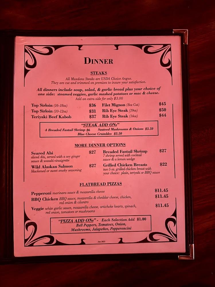 Maxdons Cocktails features a diverse menu catering to various tastes. The steak selection is impressive, including top sirloin and teriyaki kabobs. Each steak is cooked to perfection, satisfying even the most discerning meat lovers.